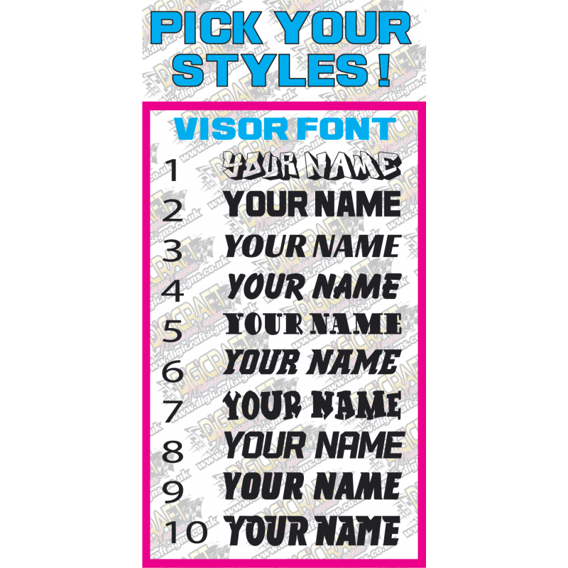 VISOR NAME ONLY in 1 Colour Choose size, colours and styles Upgrade your race car with our VI..
